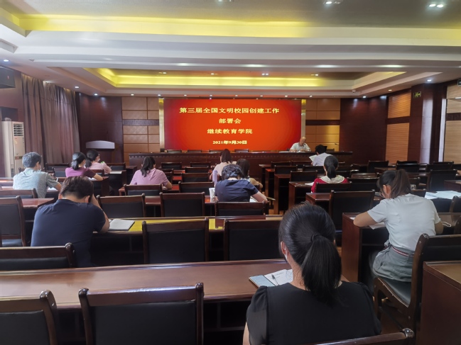 9月30日上午,继续教育学院在三楼多媒体教室召开第三届全国文明校园创建工作部署会。院党委书记范焕谦主持,全院教职工参加。