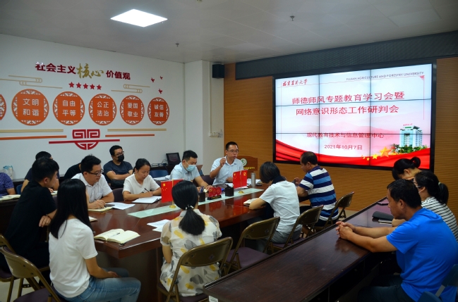 10月7日,现代教育技术与信息管理中心召开师德师风专题教育学习会暨网络意识形态工作研判会。会议由副主任曾海滨主持,中心全体人员参加。