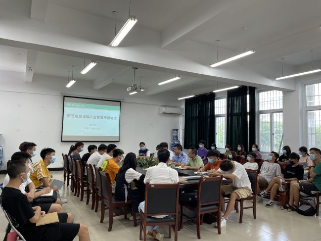 10月10日上午,林学院在诚智楼会议室组织防范电信诈骗宣传教育座谈会议。会议特别邀请淮安派出所所长陈超主讲,学院党委副书记李梅生,全体政工干部,本科及硕士各专业学生干部代表参会学习。