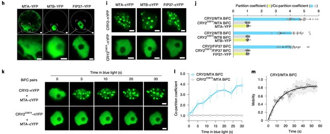 图2. CRY2-MTA在蓝光下发生相分离并招募m6A“编码器”复合体