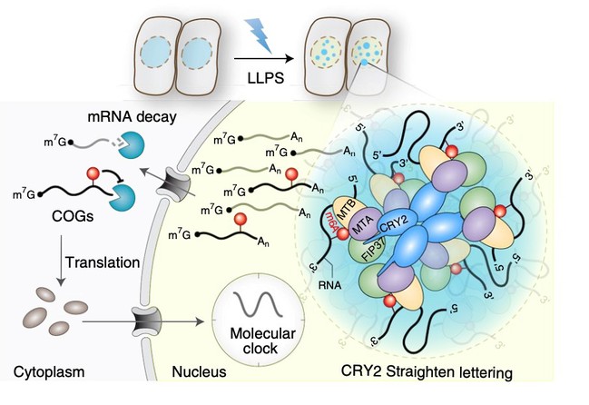 图1. CRY2 相分离募集m6A“编码器”复合体并调控生物钟节律的模型