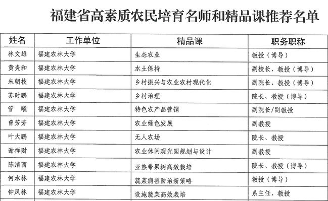 近日,福建省农业农村厅公布福建省高素质农民培育名师和精品课推荐名单,我校11位教师和11门课程入选推荐名单。