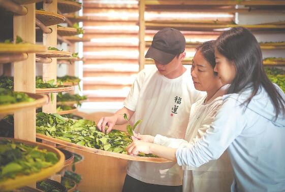 科技特派员廖红教授(中)指导茶农制茶。