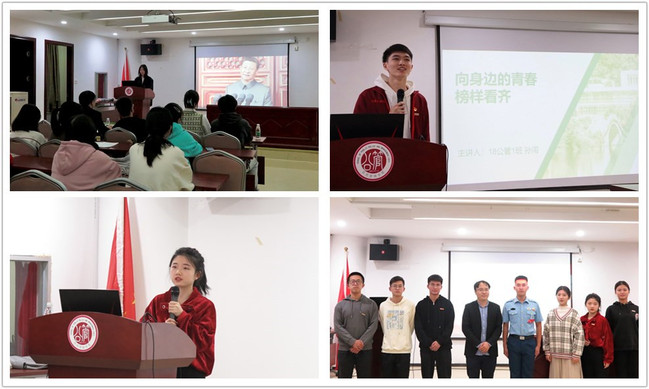会上,主持人组织同学们学习习近平总书记对青年寄语视频,重温“勤学、修德、明辨、笃实、爱国、励志、求真、力行”的16字箴言;观看2021级新生对标青春榜样采访视频。学院七位青春榜样代表依次上台进行发言。七位榜样代表分别是:潜心科研竞赛,热爱探索未知的廖阳欣;行走法援路上,为发光发热的陈哲鸿;勤勉自律学习,得偿所愿保研的郭小妹;热爱新闻传媒,积极拓宽视野的陈俐莹;实践中锻炼自我,成功入选学校支教团的孙闯;加入红十字会,投身志愿服务的徐嘉欣;边疆军旅数年,爱党爱国退伍士兵袁铎。他们立足自身经历,分享成长历程,总结成功经验,凝炼青年精神,积极发挥榜样作用。