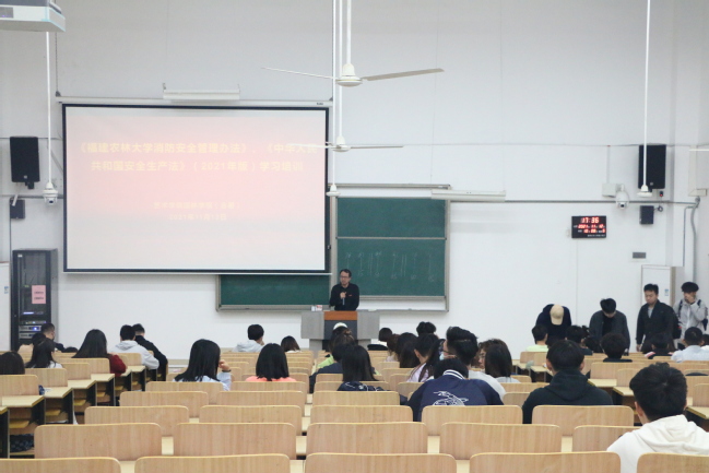 11月12日下午,艺术学院园林学院于旗山校区教学楼100教室召开学习培训会,专题学习《中华人民共和国安全生产法》《开云网页版消防安全管理办法》,落实开展“119”消防宣传月系列活动。此次培训会由学院党委副书记陈建辉主讲,学院全体政工、院团委学生会和研究生会主要学生干部及校运会运动员参加。