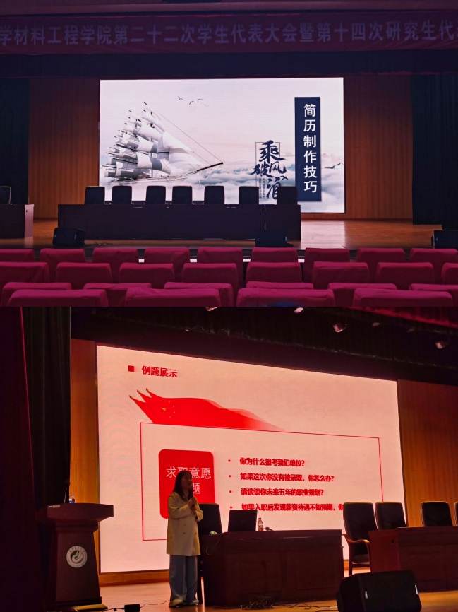 11月11日下午,材料工程学院在大报告厅举办2022届毕业生“求职面试与简历制作技巧”培训会,邀请中公教育福建分公司林豪妹、苏丽兰两位专职面试教师主讲培训。