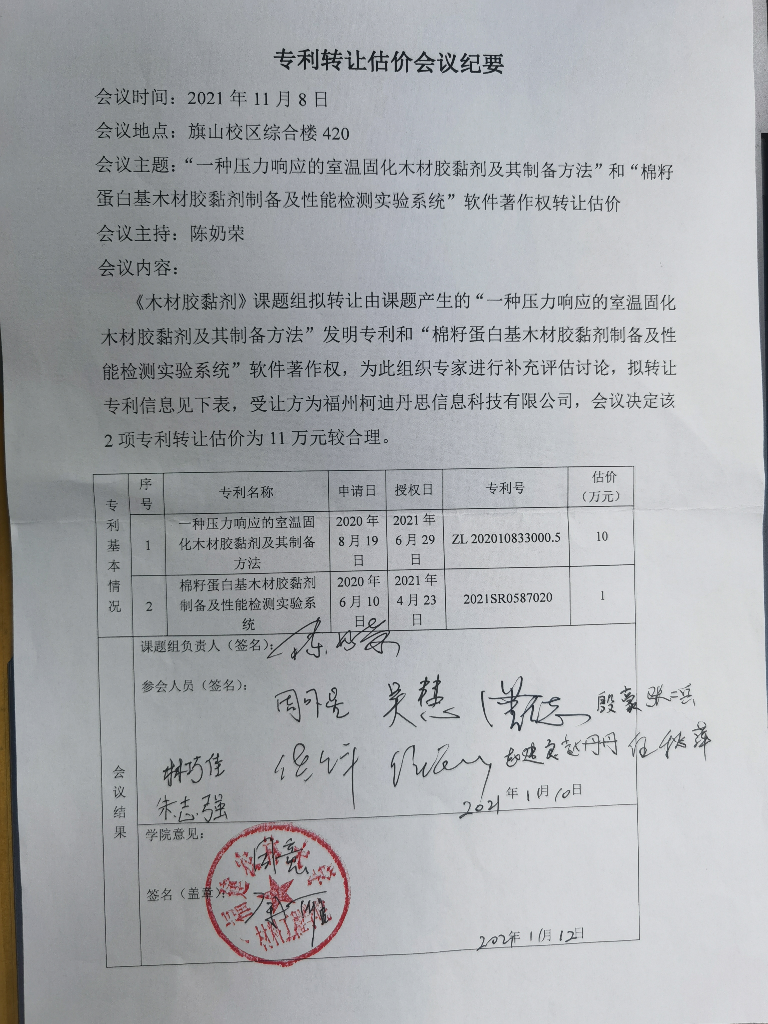 “一种压力响应的室温固化木材胶黏剂及其制备方法”和“棉籽蛋白基木材胶黏剂制备及性能检测实验系统”软件著作权转让项目,转让1项发明专利和1项软件著作权,受让方为福州柯迪丹思信息科技有限公司,知识产权转让性质为所有权转让,拟转让价格人民币合计壹拾壹万元整。