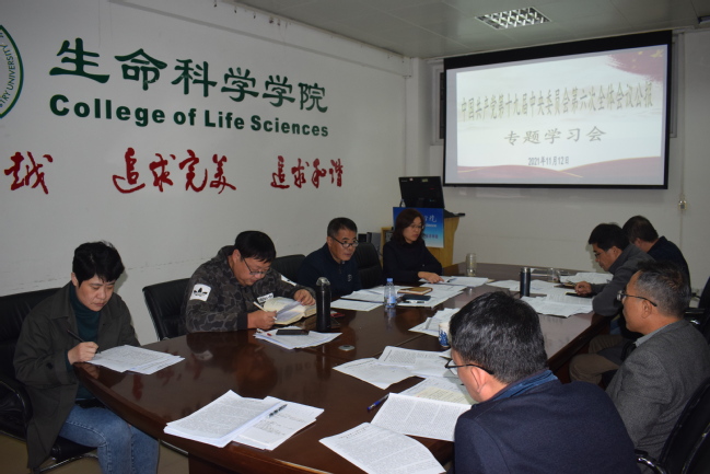 11月12日下午,生命科学学院党委召开理论学习中心组学习会,专题学习党的十九届六中全会精神。会议由学院党委书记陈建辉主持,理论中心组成员参加学习。