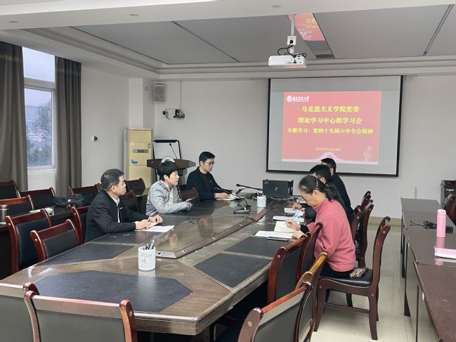 11月16日下午,马克思主义学院党委理论学习中心组召开学习会,专题学习党的十九届六中全会精神,党委理论学习中心组成员、科级干部参加学习会,会议由学院党委书记雷国铨主持。