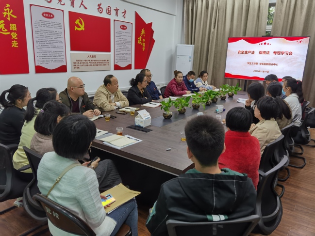 为进一步落实安全生产责任和保密责任,11月17日,学工部、学生创新创业中心召开全体教职工大会,专题学习新修改的《安全生产法》以及《高校师生保密知识读本》。