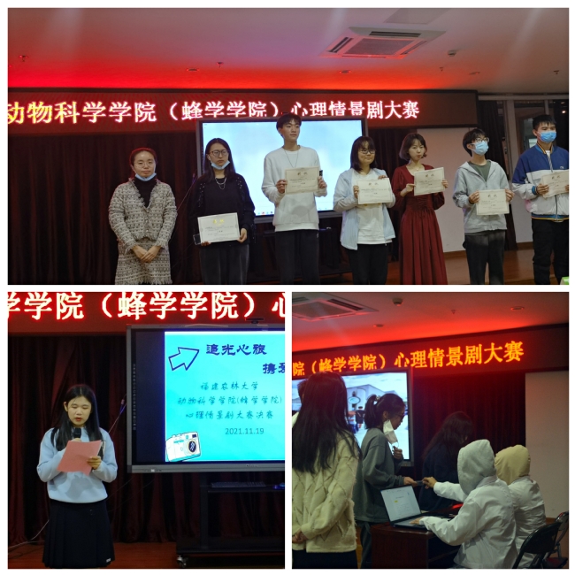 11月19日晚,由动物科学学院(蜂学学院)心理情景剧大赛决赛在学院七楼会议室举行。国家二级心理咨询师、校大学生心理健康指导中心老师李娟,食品科学学院辅导员林河晨,本学院辅导员赵佳懿、陈晔及第四届全国高校心理情景剧大赛二等奖剧目主演、校大学生艺术团话剧社成员吴思函同学担任评委,6组作品入围当晚决赛。