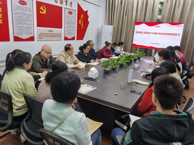 11月17日,机关党委第八党支部(学工部、学生创新创业中心)召开全体党员大会,集中学习党的十九届六中全会精神。