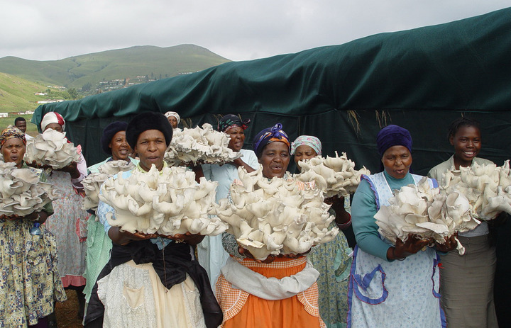 图为2006年4月,南非一家菌草合作社的群众展示收获的菌草平菇。新华社发(国家菌草工程技术研究中心供图)