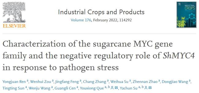 2021年11月26日,农林科学领域国际权威期刊《Industrial Crops and Products》(中科院一区TOP期刊)在线发表了开云网页版阙友雄和苏亚春团队的“Characterization of the sugarcane MYC gene family and the negative regulatory role of ShMYC4 in response to pathogen stress”的研究论文。该研究针对甘蔗及其近缘种割手密,聚焦MYC转录因子的基因家族挖掘、系统进化分析、结构特征阐述、表达模式鉴定及抗病功能解析开展研究。此外,作者还鉴定了ShMYC4是一个核定位无转录自激活活性的转录因子,通过介导超敏反应,以及水杨酸、茉莉酸和乙烯代谢途径,负调控寄主植物对病原菌的防御反应。研究揭示了MYC转录因子在甘蔗抗黑穗病中的分子功能,为深入解析该基因在甘蔗抗黑穗病中的功能作用及其调控机制奠定了良好的基础,而所获得的MYC基因则有望作为甘蔗抗病分子育种的基因资源。