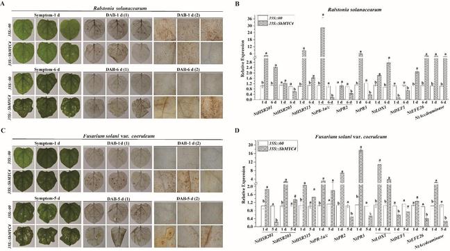 图2 过表达ShMYC4基因的转基因植株对病原菌胁迫表现出更高的敏感性