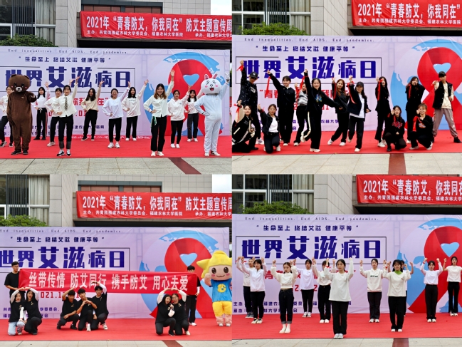 在活动预热阶段“青春防艾,你我同在”防艾标语打卡,吸引了校内近万名师生参与打卡讨论,微博话题阅读量超100万次。大家通过在校园寻找防艾标语打卡点,分享防艾视频,为艾滋病人鼓劲。“为爱,遇艾予爱”防艾快闪也同时在校园各处闪现,全校共有15个学院23支快闪队伍参与,同学们用演唱、舞蹈、情景剧演绎等形式,表达对艾滋病的关注及对艾滋病患者的关爱。由福建省司法戒毒医院带来的“‘艾’与被爱连着红丝带,携手防艾健康责任”的专题讲座,更加系统性得为我校师生普及艾滋病预防知识,引导师生自觉抗艾防艾。现场展演当天,各学院设计的防艾创意灯笼、防艾快闪决赛表演、防艾创意知识游园等吸引人们纷纷驻足。同学们用画笔将艾滋病传播途径、预防措施等在画布上一一展现,将承载着对艾滋病患者祝福的灯笼高挂于春晖桥上,向艾滋病患者传递农林大学子的爱与温暖,也向社会展示了农林大学子的责任与担当。