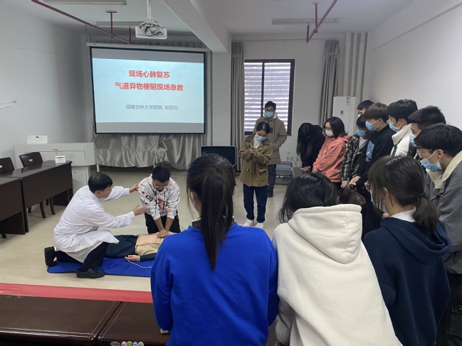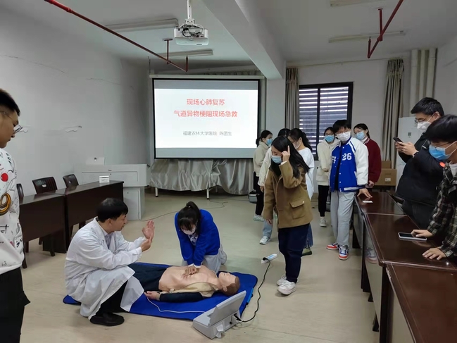 活动中,校医院院长陈团生讲解了心跳呼吸骤停、气道异物梗阻等常见突发事件现场急救方法和救护基本要领,并结合生动实例,围绕心肺复苏术(CPR)和海姆立克法进行了生动详细的讲解以及演示,参训学生认真听讲、记录,并通过人体模型进行操作演练,认真学习每个步骤,校医院医生对同学们的操作进行实时点评和纠正,现场气氛融洽热烈,同学们热情高涨,经过学习和实操,同学都基本掌握了心肺复苏和气道梗阻急救基础操作。