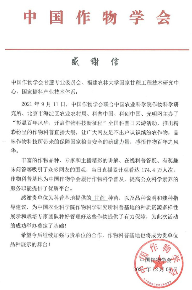 近日,中国作物学会向依托我校的甘蔗专业委员会、国家甘蔗工程技术研究中心等单位发来感谢信,高度赞赏我校为作物科普基地提供甘蔗种苗,以及品种说明和栽种指导建议,为中国农业科学院作物科学研究所科普基地的种质资源多样性展示和栽培专家团队种好管理好这些作物提供了有力保障,为全国科普日云游活动的成功举办奠定了基础。