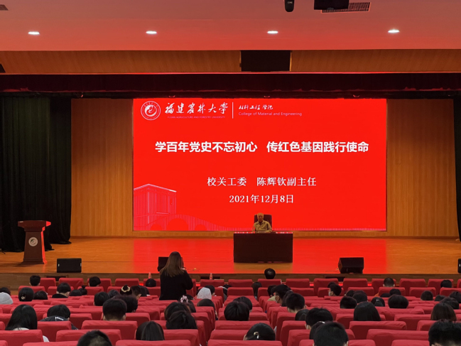 12月8日晚,由材料工程学院党委和关工委共同举办的“强国有我,请党放心”党史学习教育主题报告会在旗山校区大报告厅举行。校关工委副主任陈辉钦应邀作题为《学百年党史不忘初心,传红色基因践行使命》的讲座。学院党委书记林豪森、关工委副主任谢拥群、团委书记吴东、辅导员和学院第十六期预备党员培训班学员、2021年“青年马克思主义者培养工程”培训班学员、2021级学生400多人参加讲座,学院党委副书记苏开敏主持讲座。
