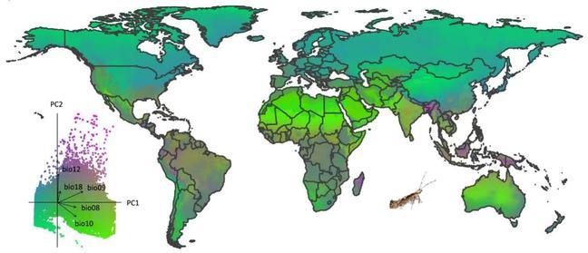 人类活动引起气候变化,特别是温度和降水的逐渐变化,正在影响物种的生存和分布。害虫成功适应这些变化的能力将影响生物多样性、粮食生产和经济发展。研究人员对小菜蛾适生区的357个个体重测序数据进行景观基因组学分析,共鉴定到3648个潜在的气候适应性位点。通过广义不相似性模型(generalized dssimilarity modelling,GDM)建模,拟合气候适应性位点与气候变量之间的关系,发现全球小菜蛾的遗传变异具有一定的纬度相似性,且温度在小菜蛾的气候适应性遗传变异中起到了重要作用。这表明来自同一纬度的小菜蛾群体具有相似的遗传组成。