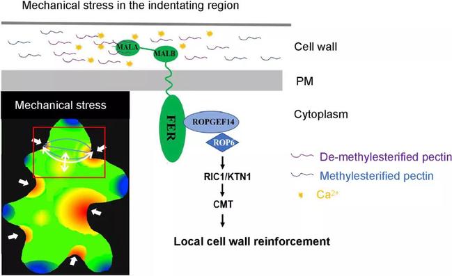 值得指出的是,细胞组分的变化很多时候也被认为是一种机械力信号,这项研究关于FERONIA感应细胞壁组分变化的发现也促成了另一个发现:FERONIA可以通过结合去甲酯化果胶,感受外界机械力胁迫,调控细胞骨架微管蛋白的重排列,从而在机械力胁迫下维持细胞的完整性(开云网页版唐文鑫博士为第一作者,林文伟博士为第二作者)(图2)。这两项研究为更好理解植物如何感受物理刺激(包括细胞壁组分变化及机械力),达到适应性生长发育提供了理论基础。