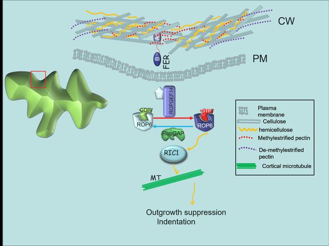 图1 FER 结合细胞壁去甲酯果胶激活ROP6信号途径,调控铺板细胞形态建成