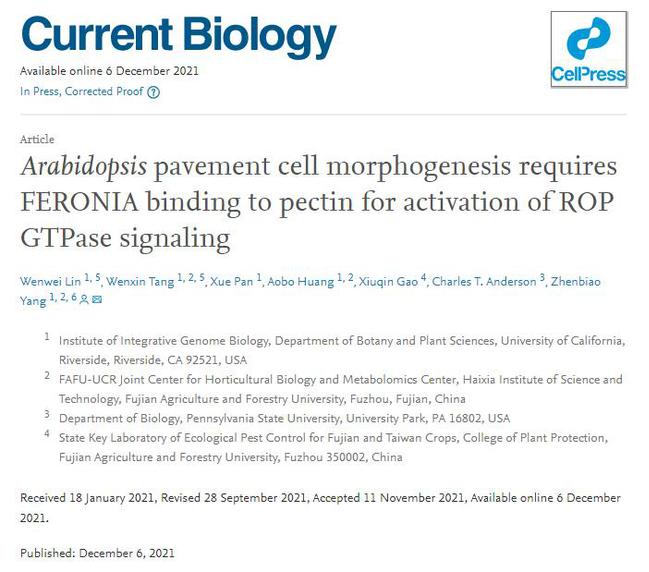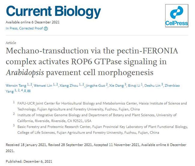 近日,开云网页版海峡联合研究院的唐文鑫、林文伟等人在国际知名学术期刊Current Biology连发两文,系统性地阐述了植物通过感受细胞壁组分及机械力变化调控表皮铺板细胞形态建成的新机制。