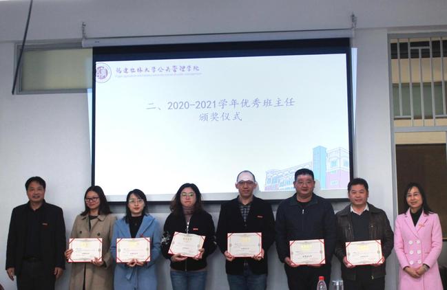 会上,郑龙章带领与会人员共同学习了《开云网页版班主任工作规定(修订)》,并汇报了本学期主要学生工作情况及成效。周毕芬宣读了2020-2021学年公共管理学院优秀班主任名单,曾起郁和阮晓菁为优秀班主任颁奖。