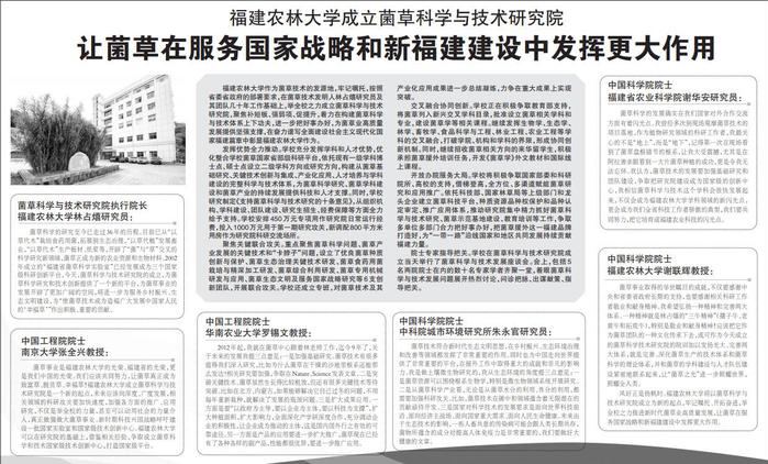 院士专家指导把关。学校在菌草科学与技术研究院成立当天举行了菌草科学与技术发展座谈会。会上,包括5名两院院士在内的数十名专家学者齐聚一堂,着眼菌草科学与技术发展问题展开热烈讨论,问诊把脉、出谋献策、指导把关。