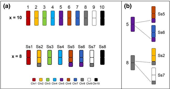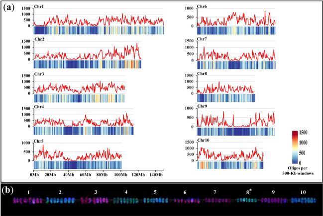 甘蔗是重要的糖类兼能源作物,基因组复杂且染色体数量众多。甘蔗属复合体中不同的野生种质材料是甘蔗杂交利用的重要野生资源库,尽管前期甘蔗属复合体不同物种之间亲缘关系有了较多的研究,然而它们的基因组组成和染色体结构目前仍不清楚。该论文中作者利用甘蔗热带种单倍型基因组设计了一套基于寡聚核苷酸序列(oligo)的染色体特异全涂染探针(图1),这套探针可用于识别甘蔗属割手密、热带种和大茎野生种中所有的非同源染色体,为今后研究甘蔗属不同材料的染色体组成和结构差异奠定基础。此外,在不同割手密材料中,Oligo-FISH定位结果提示了染色体基数x = 10经历了5号和8号染色体的断裂和融合,形成了染色体基数x = 8的割手密(图2)。