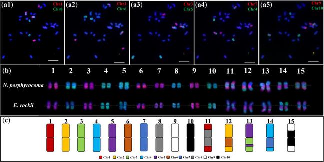 作者还利用开发的染色体全涂染探针进一步鉴定了甘蔗近缘物种芒属、河八王属和蔗茅属不同材料之间的染色体组成。通过比较染色体涂染oligo-FISH分析,提示了河八王和滇蔗茅的染色体基数为x = 10 + 5,且基数为x = 5的染色体均为基数x = 10的染色体两两融合得到(图3)。为今后甘蔗属复合体不同材料的基因组测序提供细胞学依据,也为这些野生种质材料应用到甘蔗杂交育种的遗传研究提供染色体标记。