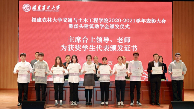 12月17日下午,交通与土木工程学院在旗山校区大报告厅举办2020-2021学年表彰大会暨“汤头建筑”助学金颁发仪式。福建省汤头建筑工程有限公司总经理郑海容、学院领导、班主任、辅导员、获表彰师生、各年级学生代表参加会议,学院党委副书记焦廷伟主持会议。