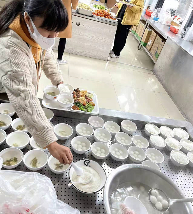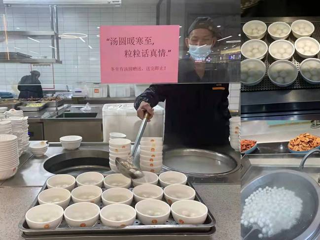 活动中,食堂工作人员将制作好的热乎乎汤圆、水饺盛好放在保温台上,并附上“汤圆暖寒至,粒粒话真情”、“时光驻足冬至,祝福随风而至”“冬至快乐”等节日祝福语,邀请师生共同品尝汤圆水饺、分享节日幸福。