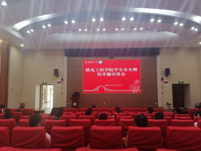 12月22日,机电工程学院学院在旗山校区小报告厅召开学生安全暨防诈骗宣讲会。校园管理办公室保卫工作科科长李龙仲、学院党委副书记曹滨斌、辅导员、各年级学生代表60余人参加了会议。
