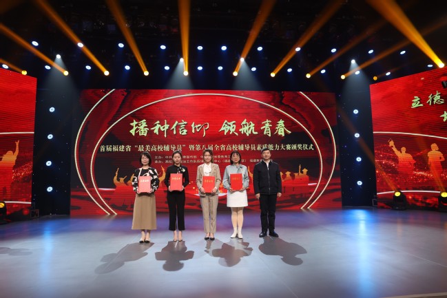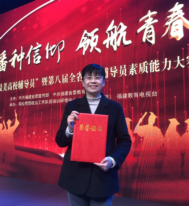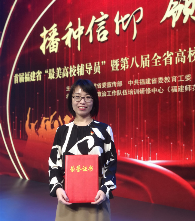 据悉,首届福建省“最美高校辅导员”推选展示活动由省委宣传部、省委教育工委联合组织开展,旨在培养选树新时代高校辅导员先进典型。在学校推荐、专家评审的基础上,经过严格的程序评选出首届福建省“最美高校辅导员”10名、“最美高校辅导员提名人物”10名。获评的20名优秀辅导员坚守为党育人、为国育才的初心,播种信仰、领航青春,在平凡的岗位上做出了不平凡的业绩,展示出有理想守信念、既教书又育人的良好精神风貌。