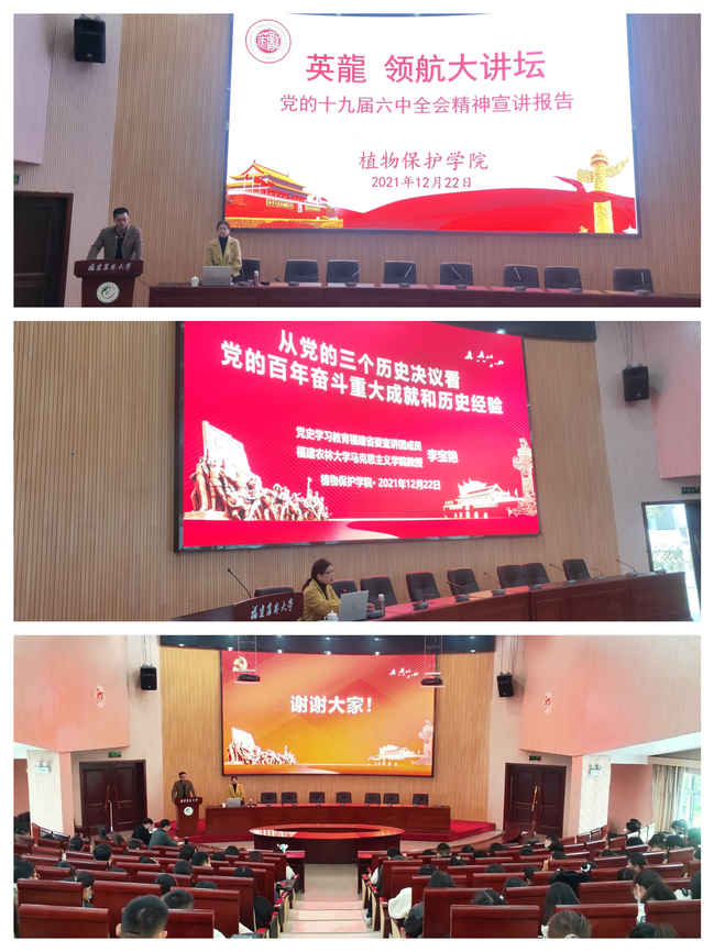 12月22日上午,植物保护学院在博学报告厅举办“英龍·领航大讲坛”党的十九届六中全会精神宣讲报告会,党史学习教育福建省委宣讲团成员、我校马克思主义学院李宝艳教授主讲。学院全体政工干部、学生党员以及班级代表等200余人参加。报告会由学院党委书记林栋主持。