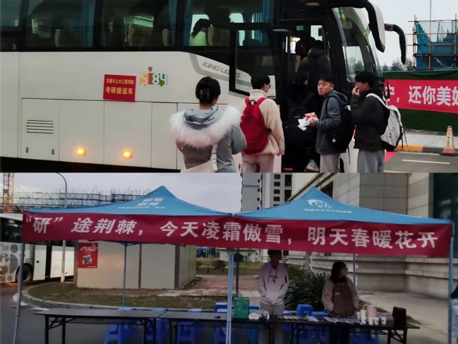 为方便考研学生安全及时抵达金山校区考点,免除考试通勤的后顾之忧,学院安排了三辆大巴车在考研期间接送考生;学院还在宿舍楼前设置了考研服务点,现场除了铺设着寓意“开门红”的红毯,还提供茶水、早餐和补给文具;与此同时,学院还为每一位考研学子送上了印有学院吉祥物和“一次上岸”字样的定制口罩,祝愿考生在做好防护的同时取得好成绩。开考前,毕业班辅导员就做好考试的相关准备、了解考场周围环境以及保持良好的心态做了指导与提醒。