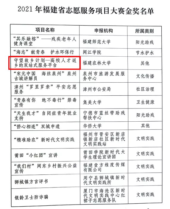 本次大赛以“八闽志愿行 筑梦新时代”为主题,自7月份启动以来,我校共青团高度重视,广泛动员积极报名,组织全校各级青年志愿服务组织结合学科专业特点,精心遴选项目参赛。经过逐级推荐,专家评审、网上公示等环节,最终经济管理学院的“守望故乡计划——高校人才返乡的双站式服务平台”项目荣获大赛金奖;公共管理学院“乐龄学堂”项目荣获大赛银奖;计算机与信息学院“‘e修哥’助老守望”项目荣获大赛铜奖。