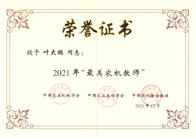 12月25日,由中国农业机械学会、中国农业工程学会、中国农机化导报主办,河南巨隆科技有限公司协办,华南农业大学承办的2021年“最美农机教师”事迹宣传发布仪式在广东广州举行。我校教师叶大鹏等全国10位农机教师荣获2021年“全国最美农机教师”。
