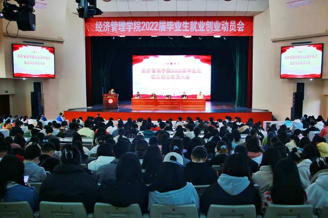 12月29日,经济管理学院在校大礼堂召开2022届毕业生就业创业动员大会。学院党委书记张开晃,副书记李健英,副院长石德金、管曦、李坤明出席大会,毕业班班主任、辅导员以及2022届全体毕业生共计600余人到场参会,大会由李健英主持。