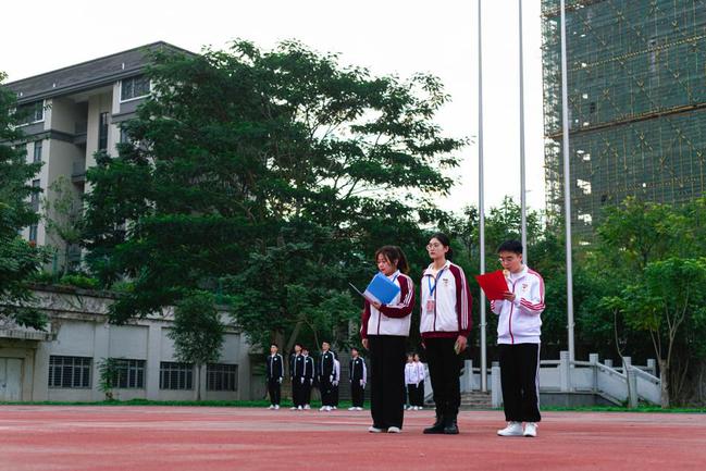 迎着初升的朝阳,升国旗仪式正式开始。国旗护卫队迈着整齐划一、铿锵有力的步伐,昂首阔步护卫国旗走向升旗台。在雄壮的国歌声中,鲜艳的五星红旗冉冉升起,迎风飘扬、熠熠生辉,同学们精神振奋,齐唱国歌,向国旗行注目礼。