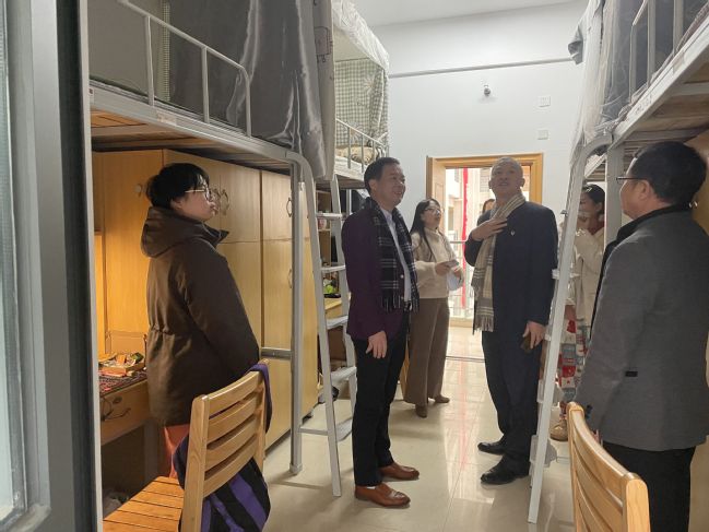 在学生宿舍,陈为德与学生进行了亲切交谈,并送上了2022年元旦的美好祝福,了解他们的期末备考情况、元旦假期安排及寒假返乡计划,提醒学生要坚持“非必要不外出”原则,根据学校疫情防控要求做好自我防护;要爱护自己的宿舍,合理摆放物品,共同营造安全美好和谐的宿舍氛围;要利用元旦假期时间查漏补缺,珍惜韶华、勤奋学习,争取考试取得佳绩。