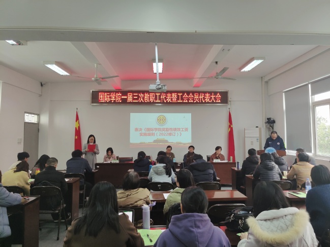 王育敏代表校工会向大会召开表示热烈祝贺,对一年来学院的工会工作给予了充分肯定,她提出,国际学院工会要紧紧围绕立德树人的根本任务,不断加强思想政治引领,团结动员全体教职员工为建设新时代高水平大学贡献智慧和力量。学院党委书记张华英指出,学院工会组织要坚定不移提高政治站位,积极引领全院教职员工听党话、跟党走。要坚定不移服务中心工作,深度聚焦学院内涵发展出实招、见实效。要坚定不移维护教职工利益,切实当好广大教职工的知心人、贴心人。在教书育人的光荣事业中,争当“四有”好老师,争做“四个引路人”,以优异的成绩迎接中国共产党第二十次全国代表大会的胜利召开。大会听取并审议了院长吴锦程做的《抢抓机遇砥砺前行在新的起点继续推进学院国际化办学工作》学院工作报告,并审议了学院工会工作报告、学院财务工作报告、教代会提案工作报告。大会还对《国际学院奖励性绩效工资实施细则(2022修订)》等向全体代表做了相关说明。