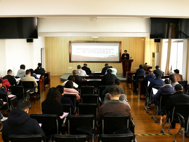 1月7日,经济管理学院一届三次教职工代表大会暨一届二次工会会员代表大会在经管楼312召开。全体正式代表参加会议,会议由院党委副书记李健英主持。