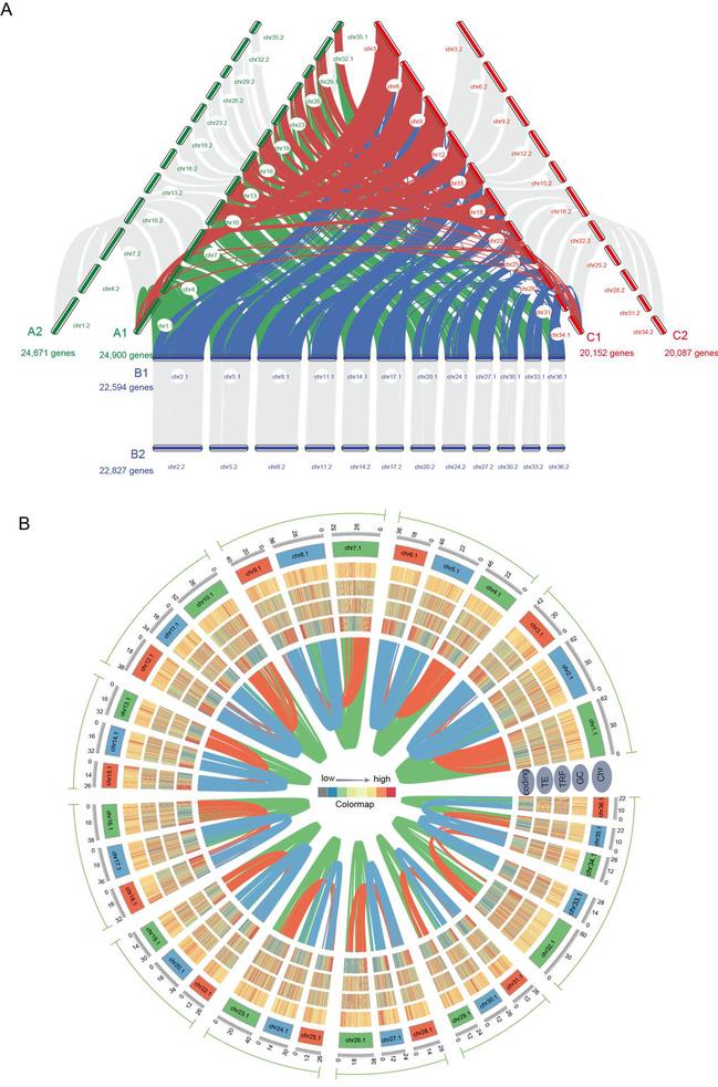 利用PacBio平台,结合Illumina和Hi-C技术,采用ALLHiC算法(Zhang et al. 2019)组装得到染色体水平的六倍体麻竹分型基因组(基因组大小为2737Mb),该基因组代表了目前已报道的基因组最大的竹种。