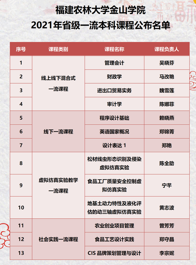 近日,福建省教育厅发布了《福建省教育厅关于公布2021年省级一流本科课程名单的通知》(闽教高〔2021〕52号),金山学院13门课程获2021年省级一流本科课程认定,获批总数位居全省独立学院首位以及39所本科院校第18位,创历史性新突破。截止目前,金山学院共有29门省级一流本科课程。