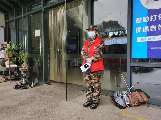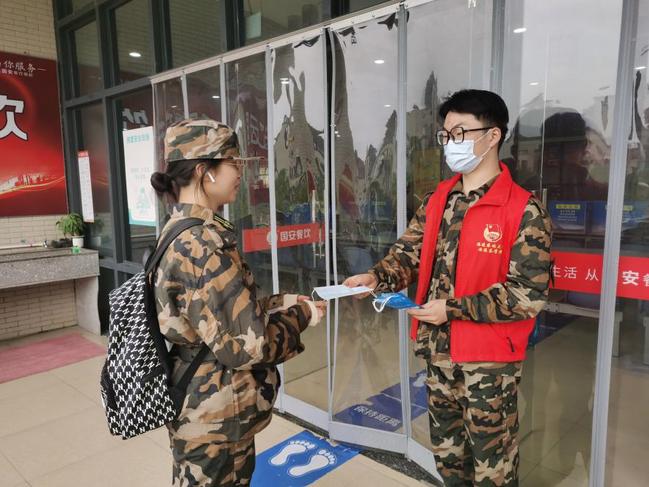 在用餐高峰期,志愿者分散在食堂入口的正侧门,监督口罩配戴情况,并给未佩戴口罩的同学分发口罩。