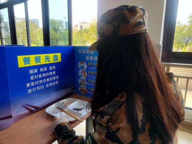 在食堂内,志愿者们佩戴工作证,身穿红马甲,礼貌友好地引导前来就餐的同学有序排队,提醒就餐同学“同向坐、间隔坐、不聚集”,并倡导“锅清、盘清、碗清”,践行光盘行动。