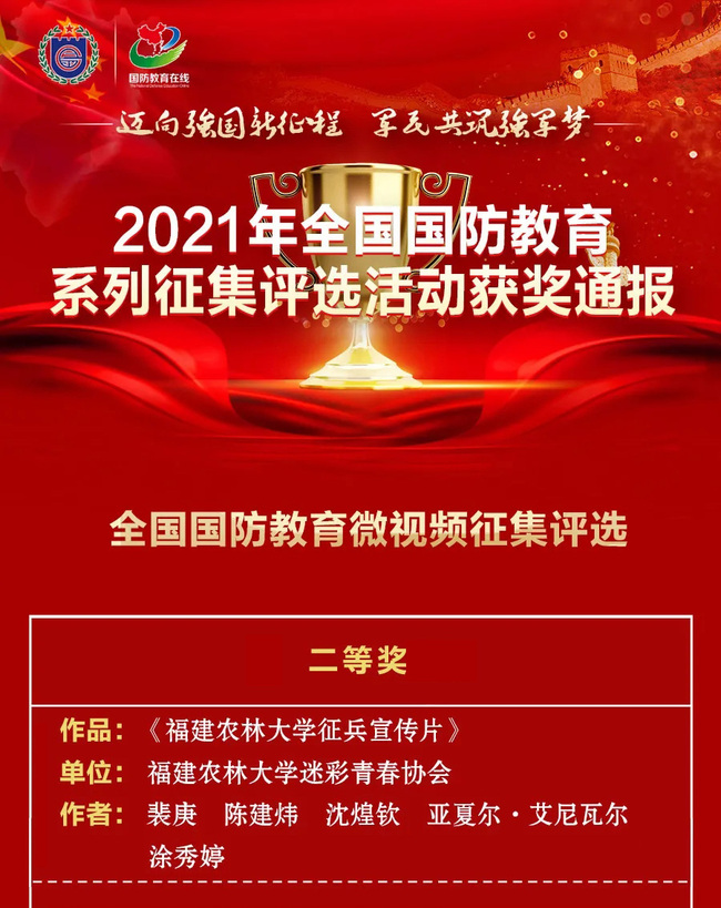 近日,在全国国防教育系列征集评选活动组委会举办的第五届“爱我国防”全国大学生主题演讲大赛和国防教育系列征集评选活动中,我校选送的《福建农林大征兵宣传片》微视频,获选2021年全国国防教育微视频征集评选二等奖。该活动在中央军委国防动员部政治工作局和中央宣传部宣传教育局共同指导下开展,活动共评选出3个一等奖、5个二等奖、7个三等奖。
