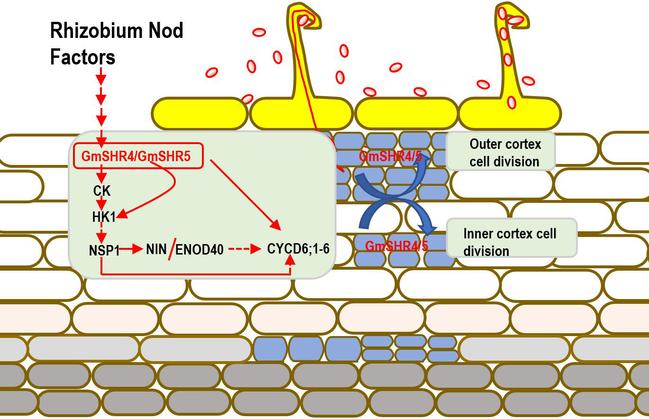 豆科植物的结瘤由两个过程协调:根瘤菌侵染和结瘤形成。过去十年的研究已经确定了早期共生阶段Nod因子激活信号通路的关键组成部分。结瘤发生始于根皮层组织中的新细胞分裂。大豆的根皮层由多层组成,Nod因子诱导的细胞分裂首先发生在外皮层细胞中,然后是内皮层组织。已经确定了许多Nod因子感知的调节因子,包括NODULE INCEPTION (NIN)、ERF家族蛋白 (ERN) 和称为结瘤信号通路 (NSP1 和 NSP2) 的两个GRAS家族蛋白。在没有根瘤菌的情况下,NIN的过度表达足以诱导皮层细胞分裂并导致自发的类结瘤结构。ENOD40是结瘤原基起始的标记基因,在结瘤开始时上调。这些Nod因子诱导基因可以直接被NSP1激活。